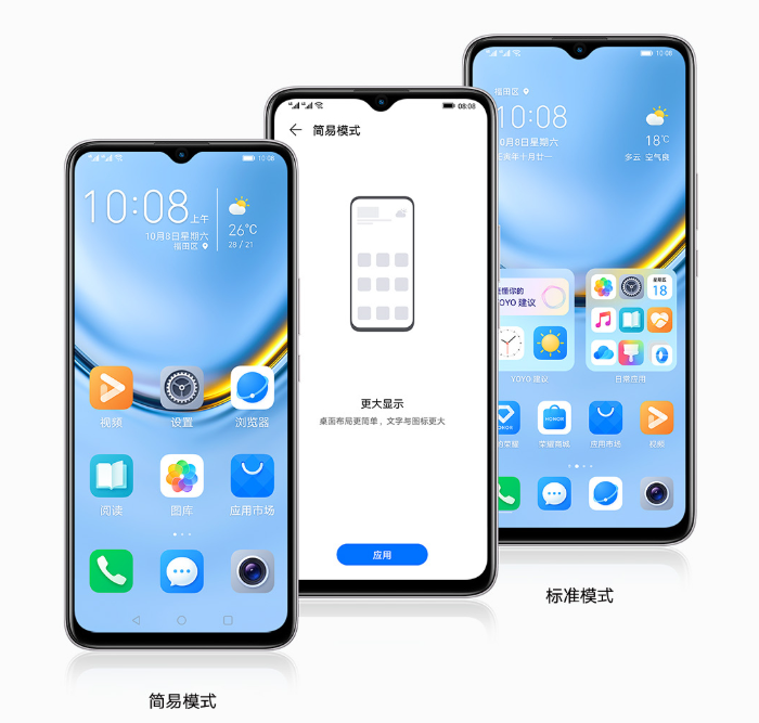 Magic UI 6.1 智慧流畅新体验,大文件夹设计,更多尺寸,更多选择。YOYO建议,更懂生活更懂你。科技有道 反诈有方*9,骚扰电话标记、拦截;诈骗信息标记、拦截;诈骗应用拦截、提醒。简易模式 一触即达,更简单的桌面布局,更大的图标和字体,更大的音量*10,让体验更轻松。