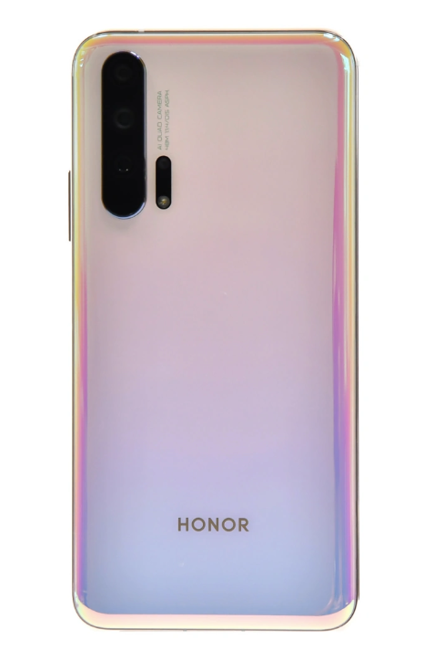 荣耀20 Pro正面搭载一块6.26英寸1080P LCD魅眼全面屏,将电源键和侧边指纹按键合一,机身采用四曲面3D玻璃机身设计。背壳则采用第二代双层膜片的工艺,在玻璃下放有幻境纹理层和着色层。在幻境纹理层,荣耀升级常规单层膜片的纹理效果工艺。着色层则可以加入第二种辅色,使之呈现由中心到四周的颜色渐变。双层膜片叠加搭配,一层炫色、一层炫光。