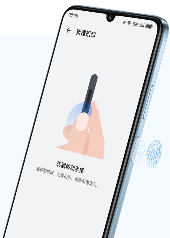 手机最大外放音量可达 86 dB11,澎湃震撼,如临现场,放大你的沉浸听觉享受。将手指紧贴按键,旋转滑动即可快速录入指纹,告别繁琐,尽享便捷舒适。