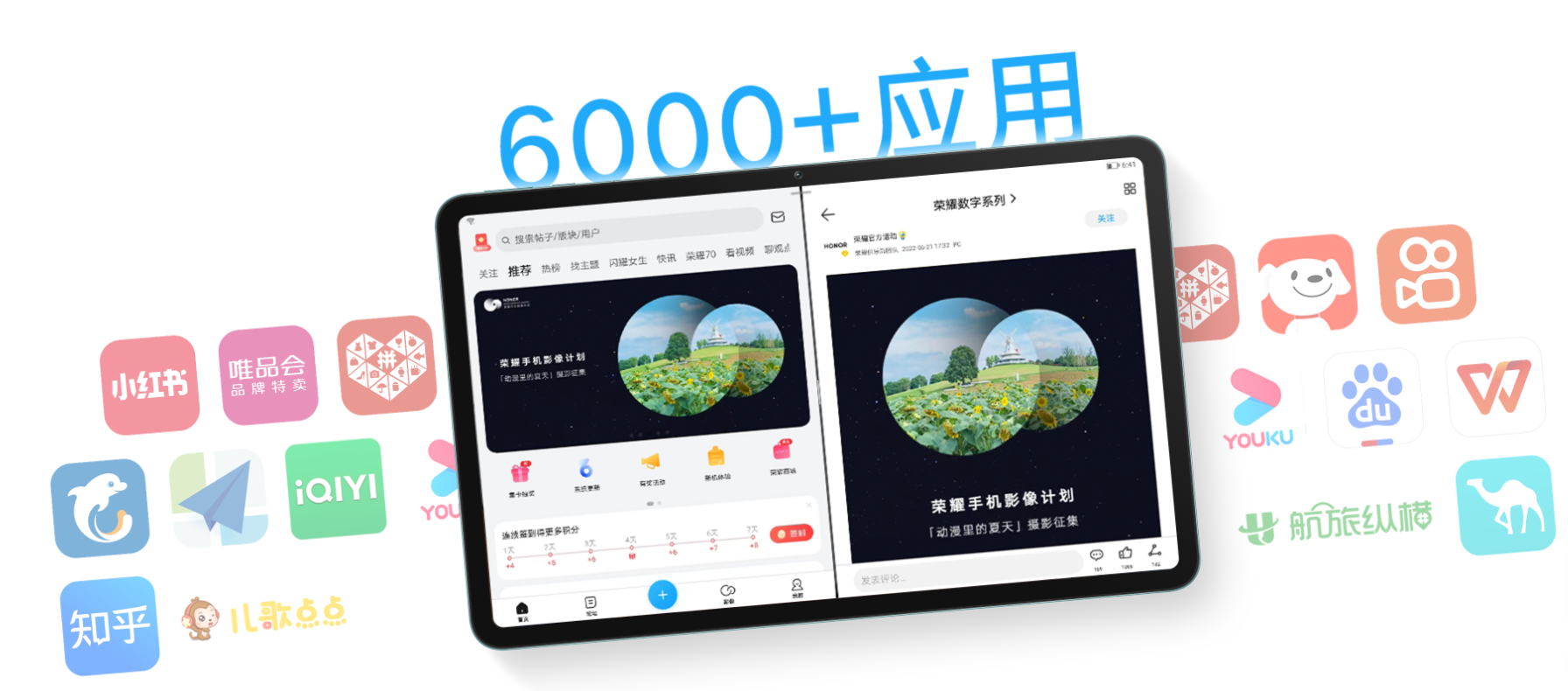 全新生产力桌面,效率UPUPUP,搭载Magic UI 6.1的全新桌面布局,大屏大文件夹,整理归纳一目了然;上划唤出服务卡片,咨询预览一步直达;YOYO建议,智能推荐常用应用,更懂你的智慧助手。多屏协同⁴,手机作业平板做,首款支持多屏协同的数字系列荣耀平板,平板与手机同屏交互,图片视频无缝拖拽,轻松把手机收到的作业资料协同到平板上做;手机协同。