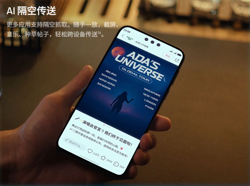鸿蒙 AI⁷,聪明有料,会整活儿,AI 能力再升级,小艺更聪明能干,还能学习新技能,越配合越默契,更多智慧功能,实用有趣,任你玩。懂你的小艺,超好用,教小艺买门票,有帮手,拍下购票流程,小艺一学就会;你的常购,小艺都记得,说声“再来一单”,根据购买历史,直接下好单。实用又有趣,超好玩,AI 一键成片,灵动效果,将静态图片一键转化为视频,定格的瞬间复现成鲜活动态¹²。AI 智能追焦,搭配云台¹³,镜头智能跟随主角,焦点跟拍稳稳拿下。AI 隔空传送,更多应用支持隔空抓取,随手一放,截屏、音乐、种草帖子,轻松跨设备传送¹⁴。AI 智感握姿,哪只手拿手机,接听按钮就在哪边,快速秒接。AI 魔法表情²,实时捕捉你的表情,智能合成到照片里,让人物表情随你变,创意照片随你玩。接住你的喜怒哀乐,AI 情绪感知主题,心情怎么变,主题就怎么变,戳戳碰碰,情绪更共振。舞林萌主²、AI 灵动主角,憨憨出道,舞力全开,点一点,跳跳舞,换换装,萌力拉满。AI灵动主角,静态人像照片生成动态风格视频,不同时节各有风采¹⁵。