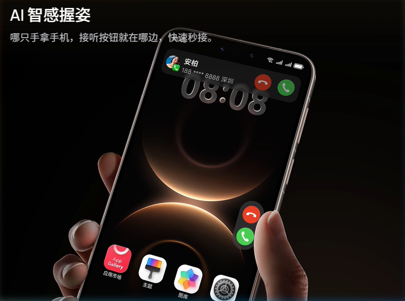 鸿蒙AI⁸,聪明有料,会整活儿;AI能力再升级,小艺更聪明能干,还能学习新技能,越配合越默契,更多智慧功能,实用有趣,任你玩。懂你的小艺,超好用,教小艺,再来一单;买门票,有帮手,拍下购票流程,小艺一学就会,你的常购,小艺都记得,说声“再来一单”,根据购买历史,直接下好单,实用又有趣,超好玩。AI一键成片,灵动效果,将静态图片一键转化为视频,定格的瞬间复现成鲜活动态²²。*云台非标配,需单独购买。AI智能追焦,搭配云台²³,镜头智能跟随主角,焦点跟拍稳稳拿下。AI隔空传送,更多应用支持隔空抓取,随手一放,截屏、音乐、种草帖子,轻松跨设备传送²⁴。AI智感握姿,哪只手拿手机,接听按钮就在哪边,快速秒接。AI魔法表情⁶,实时捕捉你的表情,智能合成到照片里,让人物表情随你变,创意照片随你玩。接住你的喜怒哀乐,AI情绪感知主题,心情怎么变,主题就怎么变,戳戳碰碰,情绪更共振。舞林萌主⁶,憨憨出道,舞力全开!点一点,跳跳舞;换换装,萌力拉满。AI灵动主角,静态人像照片生成动态风格视频,不同时节各有风采²⁵。