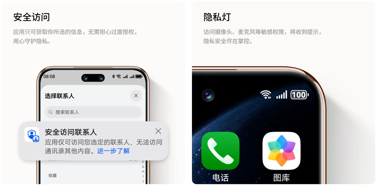 鸿蒙流畅安全,天生流畅,纯净安全。方舟引擎:游戏性能最高提升 50%³⁹,高帧游戏长时间稳帧畅玩不卡顿,释放流畅天性;整机性能提升⁴⁰,35%↑。安全访问:应用只可获取你所选的信息,无需担心过度授权,用心守护隐私。隐私灯:访问摄像头、麦克风等敏感权限,将收到提示,隐私安全尽在掌控。