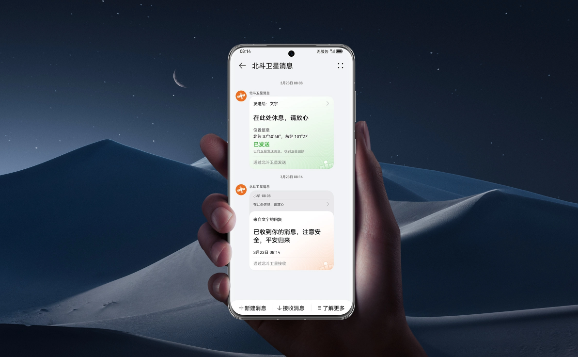 双向北斗卫星消息⁵,全球首款 ¹¹ 支持双向北斗卫星消息的大众智能手机,无地面网络信号时,不仅能通过畅连 app 发送预置文字或快捷求助标记当前状态、勾选位置信息,还能接收到对方的回复消息,关键时刻,有回复,更安心,多条位置信息可生成轨迹地图,清晰指引方向,突破地面网络限制,与世界安心畅连。