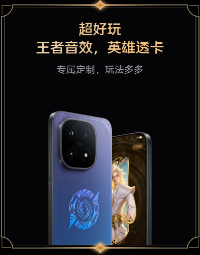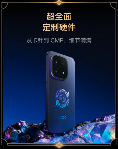 超全面的定制硬件,从卡针到 CMF,细节满满;超用心的典藏周边,多款官方授权,惊喜满满;超深度的定制体验,从主题到功能,系统级体验;超好玩的王者音效、英雄透卡,专属定制,玩法多多。iQOO × 王者荣耀十周年典藏版,拥有专属荣耀色,为你加冕。AG 磨砂工艺与 AF 镀膜带来无指纹细腻的握持感,低温感中框游戏不发烫;机身采用专属定制悬浮水晶标识,搭配光学结构色工艺,随光线流转变焕双色,尽显独特个性,既是王者装备也是典藏品。