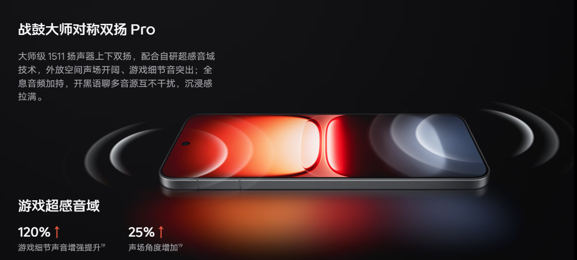 触感、振感、听感全感沉浸,游戏爽感加倍。全新一代超感触控,游戏点击、滑动全链路调优制胜快人一步,超感触控芯、算法协同升级,优化低温环境、边充边玩、多指触控三大场景触控体验问题,全场操作稳狠准。点击触控时延至低24.58ms¹⁶,滑动触控时延至低44.16ms¹⁶,瞬时触控采样率至高3200Hz¹⁷,稳定多指触控采样率360Hz¹⁷。战锤MAX双轴振感马达,实现「真·4D振感」,一颗马达同时集成X轴与Z轴,创造丰富有趣的复合振感,复合振感可模拟漂移摩擦感,方向识别¹⁸更易识别敌人方位,还有4D振感铃声减少电话遗漏,技能振感根据释放方向适配不同振感。*广告创意,请以实物为准。战鼓大师对称双扬Pro,大师级1511扬声器上下双扬,配合自研超感音域技术,外放空间声场开阔、游戏细节音突出;全息音频加持,开黑语聊多音源互不干扰,沉浸感拉满。游戏超感音域让游戏细节声音增强提升120%¹⁹,声场角度增加25%¹⁹。