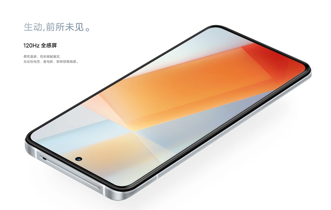 生动,前所未见。120Hz 全感屏:柔性直屏,色彩细腻真实,无论玩电竞、看电影,都有惊艳观感。其屏幕尺寸为 6.56 英寸,屏幕比例为 19.8:9,支持 120Hz 刷新率,带来流畅观感¹;拥有 6,000,000:1 高对比度,画质更鲜明;具备 1200nit 局部峰值亮度,强光下清晰可见。
