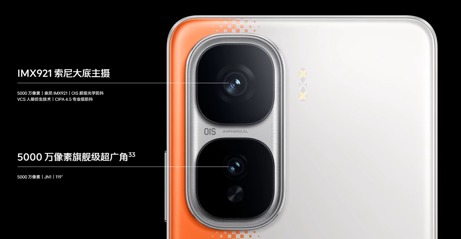 蓝厂旗舰同款,索尼 IMX921 大底传感器,OIS 超级光学防抖,CIPA 4.5 专业级防抖,VCS 人眼仿生技术,暗光画质纯净度提升 25%32。*广告创意,请以实物为准。IMX921 索尼大底主摄,5000 万像素|索尼 IMX921|OIS 超级光学防抖,VCS 人眼仿生技术|CIPA 4.5 专业级防抖,5000 万像素|索尼 IMX921|OIS 超级光学防抖|VCS 人眼仿生技术|CIPA 4.5 专业级防抖,5000 万像素旗舰级超广角33,5000 万像素|JN1|119°,5000 万旗舰级超广角,“鱼眼”效果,创作超灵感,超广角的夸张透视结合特效可拍摄出梦幻的鱼眼效果。蓝厂旗舰同款 NICE 算法,自然好风光,随手出大片,“神经图像计算”引擎,从底层改写图像算法,将降噪与细节增强流程 AI 化,更懂得“纹理”调校,细节更清晰;蓝厂旗舰同款夜景算法,作品级夜景,氛围感轻松拿捏,蓝厂最新夜景算法,带来清晰度、夜景高光压制等整体效果提升,并通过对海量高质量夜景素材进行 AI 学习和训练,更懂得调配夜景影调,提升观感,氛围感夜色大片轻松呈现,拍“暗”叫绝;蓝厂旗舰同款人像算法,写真级人像,逆光更动人,肤色自然,光影生动,发丝都根根分明,轻松拍出质感人像;Live Photo + 运动特写,高光片段,随手分享,Live Photo 功能叠加“运动特写”,可实现 120fps 慢动作效果,还可分享至第三方平台34,高光时刻,瞬间鲜活“动”起来了。