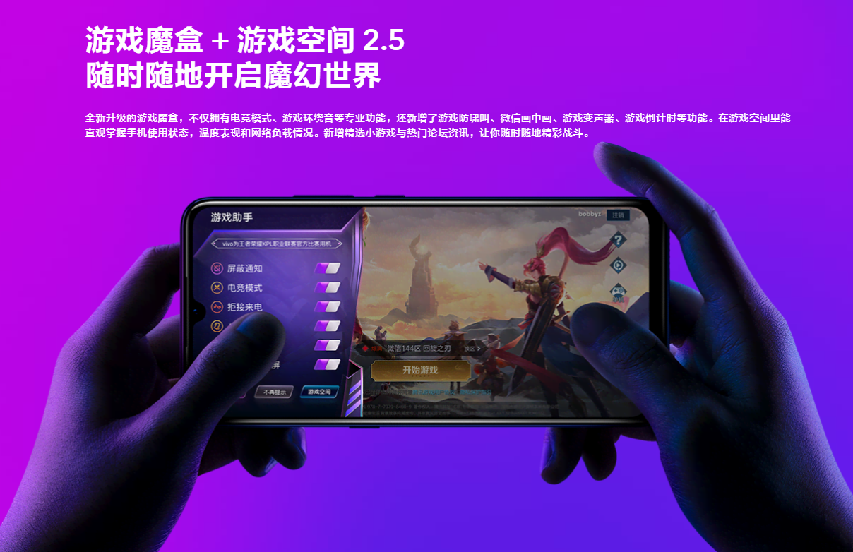 游戏魔盒 + 游戏空间 2.5,随时随地开启魔幻世界。全新升级的游戏魔盒,不仅拥有电竞模式、游戏环绕音等专业功能,还新增了游戏防啸叫、微信画中画、游戏变声器、游戏倒计时等功能。在游戏空间里能直观掌握手机使用状态,温度表现和网络负载情况。新增精选小游戏与热门论坛资讯,让你随时随地精彩战斗。