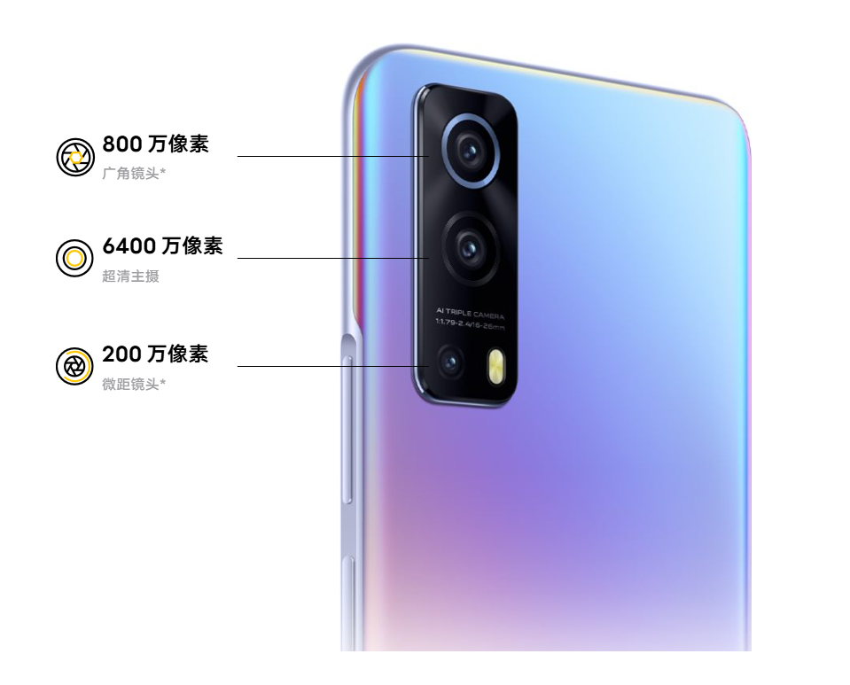 | 后置相机: | 6400万超高清主摄 + 800万超广角镜头 + 200万微距镜头 光圈:f/1.79(后置主摄),f/2.2(后置广角), f/2.4(后置微距) |
