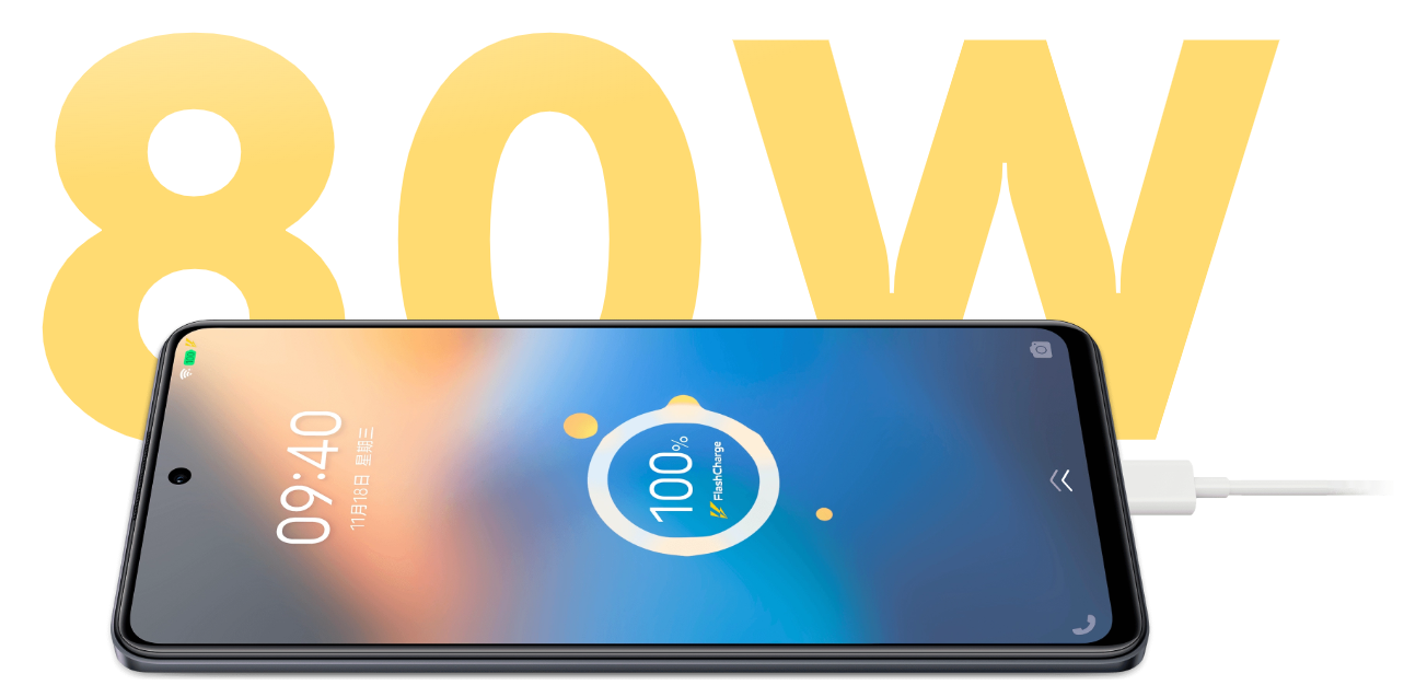 6. 搭配产品官方标配适配器 + 数据线,至大可支持 80W 闪充; 实际充电功率会随场景变化而动态调节,请以实际使用情况为准。充电数据源自我司实验室环境测试所得,测试环境: 环境及手机温度 25℃±1℃,测试条件:手机电量为 1% 时,关闭除通话以外的其他手机服务和功能,在熄屏状态下,搭配产品官方标配充电器 + 数据线充电;实际数据可能因测试环境不同、用户充电场景不同、手机充电初始温度不同、电池长期使用损耗等因素存在差异。