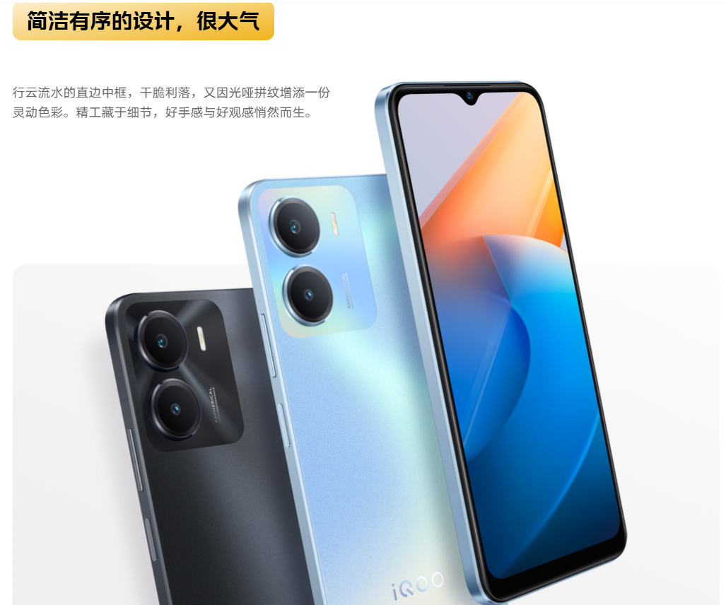 iQOO Z7i 简洁有序的设计,很大气。行云流水的直边中框,干脆利落,又因光哑拼纹增添一份灵动色彩,精工藏于细节,好手感与好观感悄然而生,采用凝光 AG 工艺、光哑拼纹、硬朗直边,拥有冰湖蓝、月影黑两种配色,且两种配色均采用凝光 AG 工艺、光哑拼纹、硬朗直边。