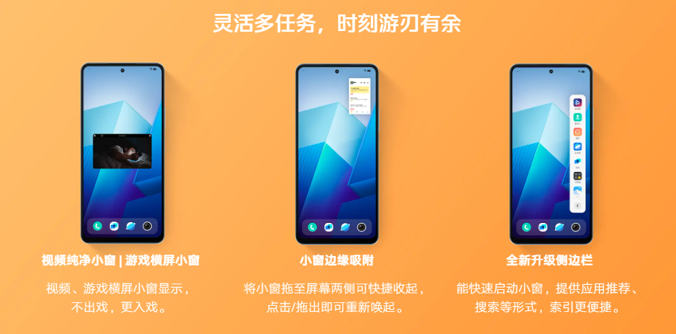 「我」可靠便捷,「你」安心选择。更得心应手,原地复活机制,被关闭的 App 再次启动时,快速恢复至关闭前的状态;灵活多任务,时刻游刃有余,视频纯净小窗 | 游戏横屏小窗,视频、游戏横屏小窗显示,不出戏,更入戏;小窗边缘吸附,将小窗拖至屏幕两侧可快捷收起,点击/拖出即可重新唤起;全新升级侧边栏,能快速启动小窗,提供应用推荐、搜索等形式,索引更便捷;AI 双语字幕,支持英语、日语、韩语,全新 Jovi 音色,新增超拟人好友音色、知性御姐、奶音男孩、元气女生音色。