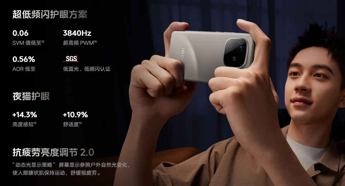 *本产品非医疗器械,不具疾病治疗功能,护眼是指 iQOO Z9 Turbo+ 通过多维度技术实现缓解眼部疲劳、降低眼部不适感。