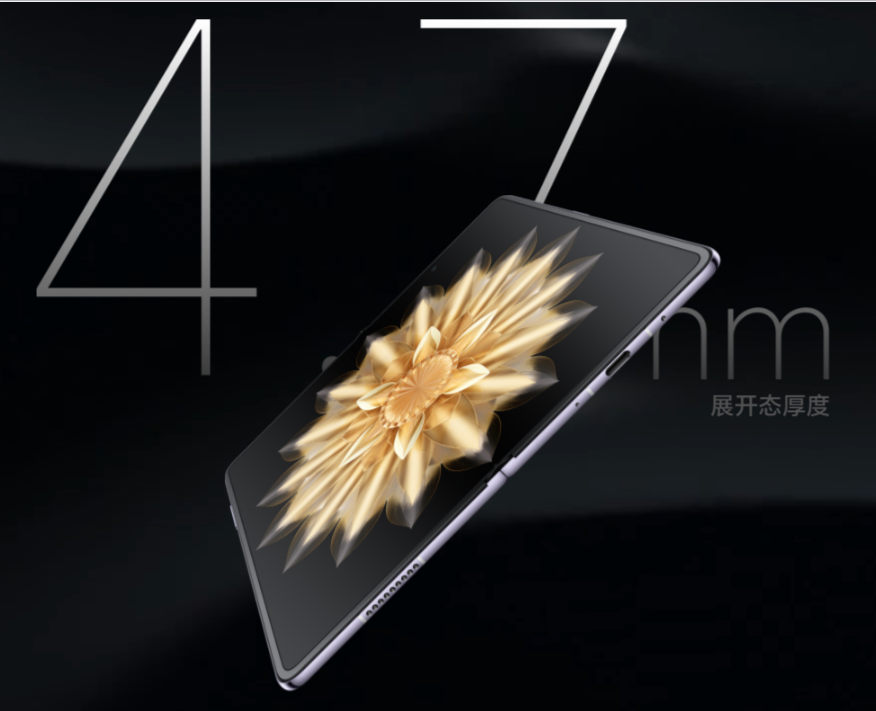 1. 数据源自荣耀实验室,“毫米时代”特指折叠屏闭合态厚度低于 1 厘米。9.9mm为雅黑色素皮版折叠态厚度,4.7mm为雅黑色素皮版展开态厚度,整机尺寸不包含内外屏保护膜的厚度以及摄像头凸起部分;受产品配置和制造工艺、测量方法的影响,实际产品尺寸可能有所差异,请以实物为准。