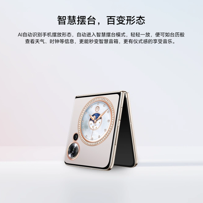 灵动胶囊,了如指掌,外屏灵动胶囊,打造轻打扰的交互体验,快速查阅关键信息,专注不中断,信息不错过。全屏显示,全天陪伴,全天候全屏显示9,全域低功耗LTPO自适应降帧技术,外屏支持接近0.1Hz刷新率,功耗更低,能够做到全天常亮。智慧摆台,百变形态。AI自动识别手机摆放形态,自动进入智慧摆台模式,轻轻一放,便可如台历般查看天气、时钟等信息,更能秒变智慧音箱,更有仪式感的享受音乐。外屏创新玩法,外屏气息唤醒。无需展开手机,无需唤醒词,更快速更直接地给智能助手安排工作。内外屏接续开合内外屏无缝接续,正在进行中的任务不中断10。外屏NFC无需展开手机,地铁公交门禁车钥匙NFC外屏也可直接刷。