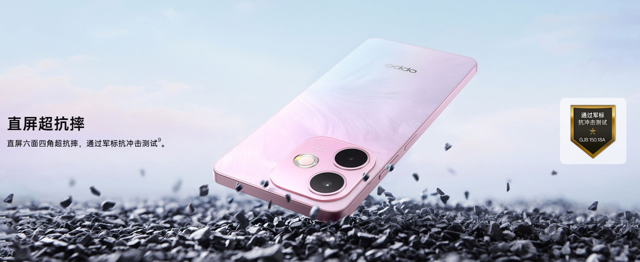 抗摔与环境适应能力上,实现360°抗摔,横竖里外都抗摔,直屏六面四角超抗摔,通过军标抗冲击测试⁹。采用超抗摔金刚石架构,主板上盖采用高强度铝合金,增强抗摔性,搭配金刚四角、防撞梁设计、安全气囊设计,抗摔能力提升1.6倍;屏幕采用旗舰同款晶盾玻璃,抗摔能力对比OPPO Reno11使用的屏幕玻璃和后盖玻璃提升1.6倍,抗划伤能力对比OPPO Find N3使用的外屏玻璃提升3倍¹⁰。该机还通过了中华人民共和国国家军用标准GJB 150A-2009体系下14项环境试验测试⁹,包括高温、低温、温度冲击、淋雨、积冰冻雨、砂尘、盐雾、太阳辐射、湿热、振动、流体污染、霉菌、加速度、冲击等,耐严苛环境能力出色。