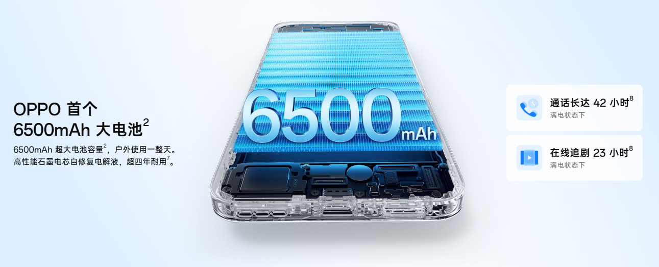 超长续航,闪速充电,OPPO A5搭载OPPO首个6500mAh大电池²,超大电池容量满足户外使用一整天需求,其高性能石墨电芯搭配自修复电解液,实现超四年耐用⁷。满电状态下,通话长达42小时⁸,在线追剧23小时⁸;支持45W超级闪充,0~43℃超级闪充⁸,零下20℃极寒充电⁸,无论严寒酷暑,都能快速补能,充电10分钟即可在线追剧6小时⁸。