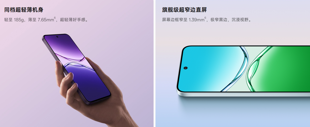 OPPO A5配备超抗摔直屏,拥有同档超轻薄机身,轻至185g,薄至7.65mm⁶,带来超轻薄好手感;同时搭载旗舰级超窄边直屏,屏幕边框窄至1.39mm⁶,极窄黑边营造沉浸视野。