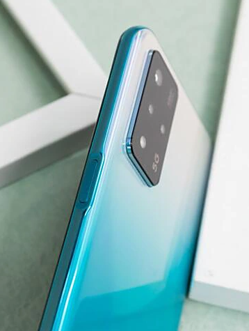 OPPO A93s正面搭载一块LCD打孔屏。夏光海配色版本采用光滑的亮面设计,与其它两个版本不同。手机背面从上到下颜色渐渐变深,主色调为淡蓝色。在不同角度下,手机会以摄像头模组为中心向外散发出变幻的光影线条。而白桃汽水和夏夜星河两种配色则采用了磨砂工艺。