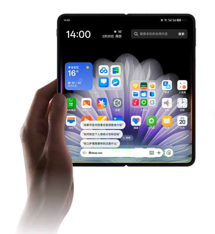 8.93mm 超薄机身¹,8.12 英寸超大主屏⁴,展开够大,合上超薄,OPPO 办公助手™,小事不用回公司。超长续航冰川电池,5600mAh 超大电量¹⁶,早出晚归不差电,Snapdragon 骁龙 Elite,全新骁龙® 8 至尊版移动平台,潮汐引擎,释放潜能,旗舰性能,持久流畅。