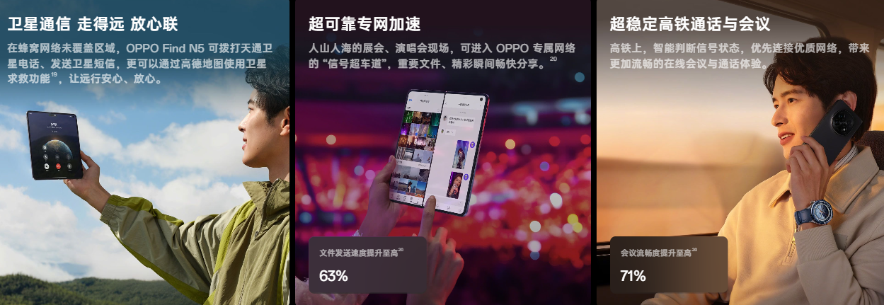 卫星通信,走得远,放心联,在蜂窝网络未覆盖区域,OPPO Find N5 可拨打天通卫星电话、发送卫星短信,更可以通过高德地图使用卫星求救功能¹⁹,让远行安心、放心。超可靠专网加速,人山人海的展会、演唱会现场,可进入 OPPO 专属网络的 “信号超车道”,重要文件、精彩瞬间畅快分享²⁰,文件发送速度提升至高 63%²⁰。超稳定高铁通话与会议,高铁上,智能判断信号状态,优先连接优质网络,带来更加流畅的在线会议与通话体验,会议流畅度提升至高 71%²⁰。