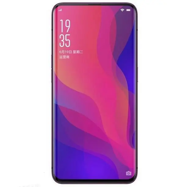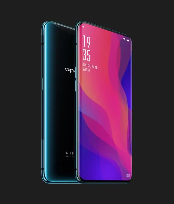 OPPO Find X机身正面采用三星定制的曲面柔性OLED屏幕,背面采用了3D叠层流光点彩工艺,机身背面没有摄像头、后置指纹识别和闪光灯。而在背壳顶部,有一块凸起的反光结构,这也正是双轨潜望结构的一部分。机身侧面采用了侧边金属中框,并在其中添加了注塑的“信号溢出带”。机身底部取消了Micro-USB接口和3.5毫米耳机口,换成了USB Type-C接口,旁边是扬声器以及SIM卡槽。此外,机身顶部有一个降噪麦克风和光线感应器,SIM卡槽上的两个卡位是正反放置的。