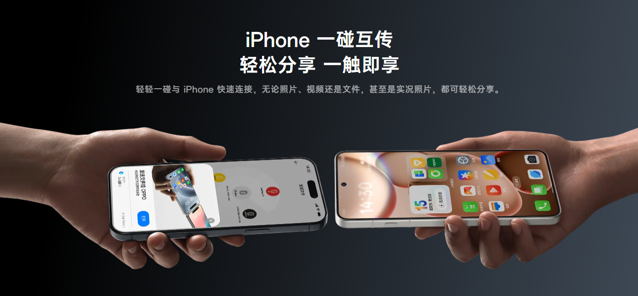 搭载全自研山海通信增强芯片¹⁹,连接随心、畅快稳定,带来更稳定、流畅的通信体验,并提升弱网条件下的网络可用性,针对高速移动、拥塞、弱网等场景做出特别优化,在极端条件下依然畅快稳定。地铁网络卡顿率至多降低78.61%,高铁网络卡顿率至多降低55.12%,支持公里级无网畅聊(需在扬声器通话模式下,且周边环境空旷,目视无遮挡,无干扰;通信测试结果均来自OPPO实验室,地铁网络优化效果通过直播观看场景测试,高铁网络优化效果通过在线会议场景测试;因所处环境、软件版本、地理位置等不同可能存在差异,实际支持情况请以产品实际为准)。卫星通信功能让用户走得远、放心联,在极限区域的无信号时刻,还可拨打卫星电话、发送卫星短信,且搜星速度更快,连接更稳定,安全放心可靠²⁰(仅OPPO Find X8 Ultra卫星通信版支持,仅支持开通天通卫星业务的中国电信卡使用,实际使用情况取决于运营商业务部署)。支持iPhone一碰互传,轻松分享、一触即享,轻轻一碰与iPhone快速连接,无论照片、视频还是文件,甚至是实况照片,都可轻松分享。
