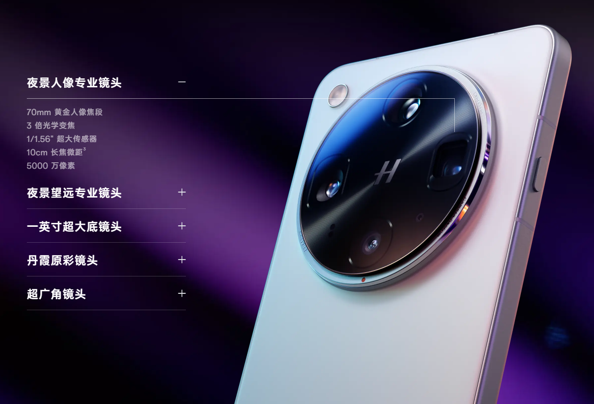 夜景人像专业镜头,超大光圈超大底设计,实现3倍光学变焦与10cm长焦微距的新突破,搭载超晶态蓝玻璃,抬手直出纯净、真实、自然的夜景氛围感,进光量提升至150%⁵,配备超大F2.1长焦光圈,5000万像素,超晶态蓝玻璃让红外截止效率提升81%⁵,采用超低反镜头镀膜。夜景望远专业镜头,超高倍率的135mm大底潜望长焦望远镜头,突破人眼极限,眺望远方依旧细节清晰,画面生动,进光量提升至251%⁵,F3.1超长焦大光圈,5000万像素,采用超低反镜头镀膜、超薄倒置潜望镜头结构与高精度棱镜加工工艺。一英寸超大底镜头无惧明暗光影,各种场景全面驾驭,同时支持23mm、28mm、35mm、47mm四个经典品质焦段随心切换,构图如呼吸般自由,画面高清有质感,其配备1英寸超大底传感器、F1.8超大光圈、5000万像素,采用超低反镜头镀膜与1G7P高折射率玻璃镜片。丹霞原彩镜头肤色有专攻,拍人更出众,通过像素级色彩识别与分析,让画面中每个区域的色彩都能鲜活呈现,精准还原人物肤色,人像效果更上一层楼,支持分区色温感知与原彩ProXDR显示技术(*画面仅作功能示意,请以产品实际为准)。