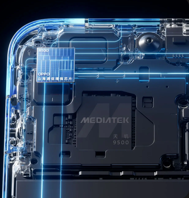 23. 天线长度对比 Find X8 系列低频天线长度。通信测试结果均来自 OPPO 实验室,因测试环境、方法等不同,数据可能存在差异。R100 为芯片名称,图例为芯片示意,仅作参考,请以实际使用为准。