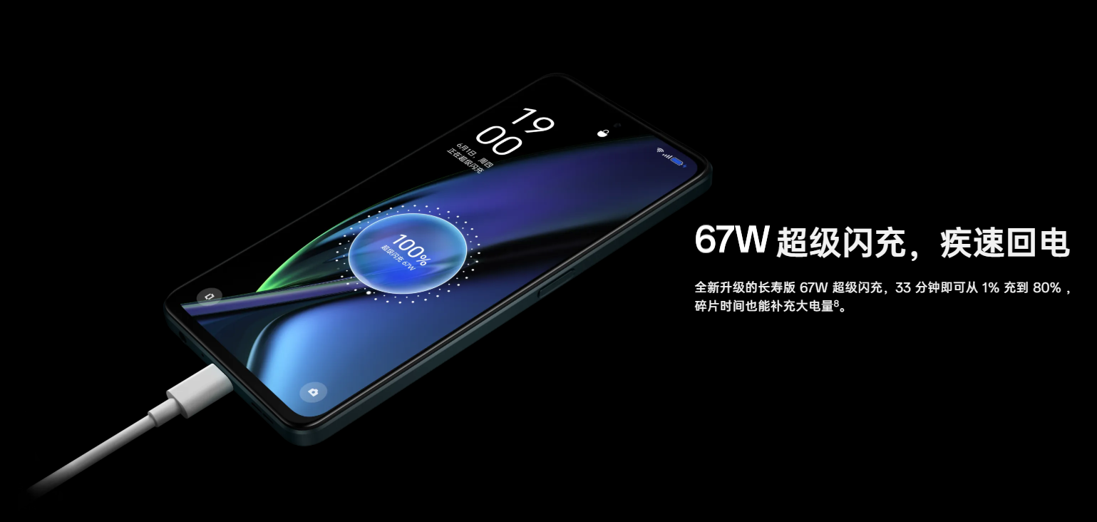 超快闪充超强续航,长寿闪充,经久耐用,搭载自研智能电池健康引擎,1600 次充放电循环后,电池健康度依然可以保持在 80% 以上,使用 4 年后手机电池依然耐用6。5000mAh 电池省心续航,5000mAh 超大电池配合 6nm 低功耗处理器,打造可靠续航,轻松畅玩一整天7。超级闪充,疾速回电,全新升级的长寿版 67W 超级闪充,33 分钟即可从 1% 充到 80% ,碎片时间也能补充大电量8。
