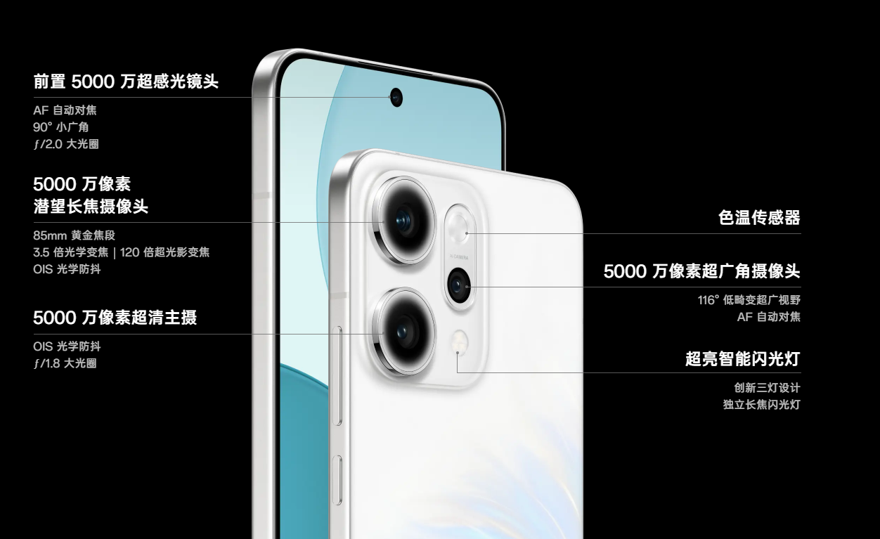 实况照片引领者,放大此刻生命力,让照片 Live 起来,Get 当季最潮玩法。高清长焦实况照片、4K 视频转实况照片、闪光实况照片,有三合一 Live 图神机在手,各种潮流玩法一台 Reno 就够。高清长焦实况照片,放大拍实况更有生命力,潜望长焦放大拍,定格主角特写,避开人群自由构图,让美好不分淡旺季;85mm 黄金焦段¹²,拉近身后的美好,人与景更合拍;旗舰级双重曝光,定格超清封面,动态纤毫毕现。4K 视频转实况照片,帧帧都 4K 更有生命力,原生 4K HDR 画质,从容截取黄金三秒,小红书分享高清又高光,美妙不打折;慢动作视频的一瞬,用实况照片轻松分享,小照片刻画大乾坤;希区柯克变焦的大片,用实况照片轻松分享,故事感一眼入迷。超鲜活画质,想变得有趣还能再有趣。闪光实况照片,闪光拍实况更有生命力,超亮智能闪光灯,闪亮登场,同档首创三灯方案,广角和长焦全覆盖,灯光一闪,Get CCD 同款氛围感。实况照片动态壁纸,念念不忘有回响,可爱萌宠的动态瞬间,旅拍风景的张力时刻,都能设为动态壁纸¹³,每次亮屏重温拍摄时的情感和氛围。AI 灵感成片,摄影师构图,轻松出好片,深度学习海量摄影师作品,智能推荐超绝构图和滤镜,一键让原片妙手回春,秒变有范儿的大作。