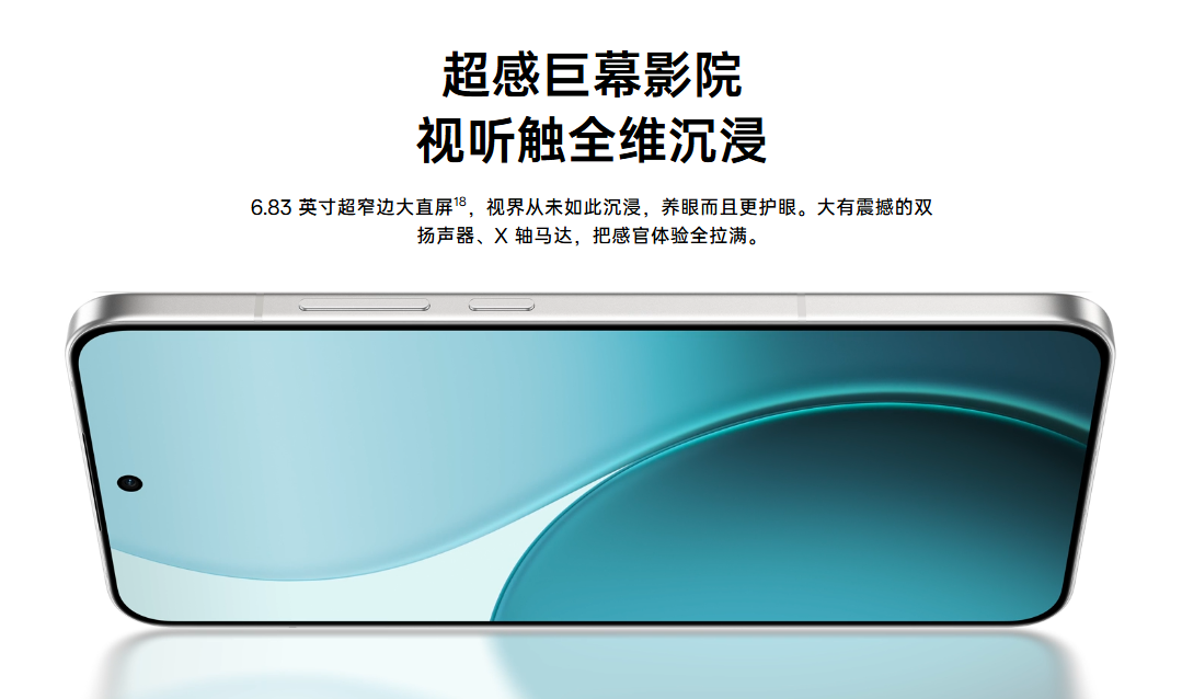 超感巨幕影院,视听触全维沉浸,6.83 英寸超窄边大直屏¹⁸,视界从未如此沉浸,养眼而且更护眼;大有震撼的双扬声器、X 轴马达,把感官体验全拉满。3840Hz 调光,降低闪烁更护眼¹⁹;10.7 亿色,臻彩生动显示;1.5K 分辨率,细节清晰锐利。X 轴线性马达,马达强劲,游戏够劲;立体声双扬声器,低频澎湃,音质高保真。