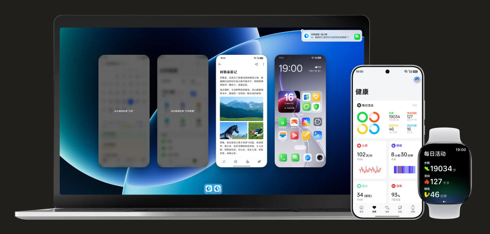 跨生态互联方面,手表互联²⁰,手机来电、短信和流体云信息,Apple Watch抬腕可见,运动记录无缝同步手机,还支持运动勋章分享。电脑互联²¹,手机屏幕搬上Mac,至多5个窗口同开,实时同步手机通知,万能小布也已入驻,让Mac更聪明。