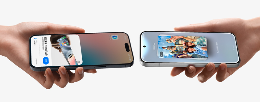 8. iPhone 互传需安装「OPPO互联」应用,并将手机升级至最新软件版本系统。互传速度可能因使用环境、设备状况、软件版本、测试方法、个人使用习惯等因素不同而存在差异,请以实际体验为准。