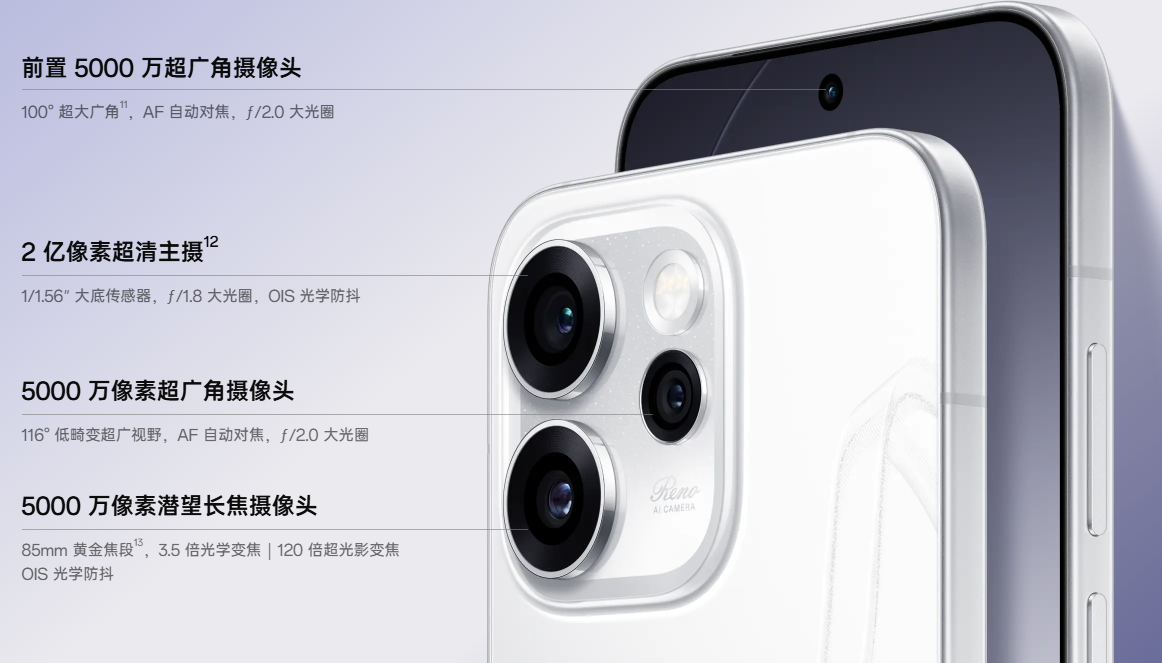 超稳超清晰的直播神器,前后超防抖,画面超清晰,双面防抖科技、三麦智能降噪,前置大广角防抖,定制100°镜头缓解运动抖动⁵,后置全新升级光学防抖模组,防抖效果稳上加稳;原生三麦克风降噪,有效过滤背景噪音,让你直播时字字句句都清晰⁶。前后四主摄,装备超神了,前置5000万自动对焦镜头,轻松拍出毛流感,发丝睫毛清晰自然;后置2亿像素超清主摄,搭配双5000万超广角、长焦镜头,从特写到远景都拿捏。AI直播高光切片,精华片段一键回录,无论是榜一打赏、粉丝好评,还是在线人数新高,不必匆匆忙忙记录,也不错过存档直播高光时刻,60秒时光倒流、1080P超清分辨率,一键回录精华切片⁷。6小时蓝光直播,不惧发烫卡顿⁸,高性能石墨电池特来电,潮汐引擎芯片级优化特省电,刷新Reno直播续航记录,给充电宝放个假。直播旁路供电,直播供电还有大招,充电电流直接给手机系统供电⁹,不仅边充边播更低发热,还有利于电池健康,久用也耐用。山海通信增强双芯,移动网络、Wi-Fi连接双双增强,还支持智慧云加速,至高降低20%卡顿率,网红餐厅直播,人多拥塞也有高画质;户外景点走播,弱信号流畅开播¹⁰。