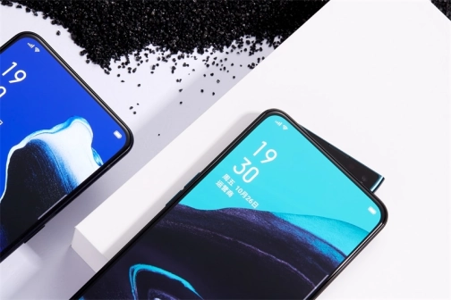 OPPO Reno2的正面采用了一块6.5英寸全景屏,极窄边框设计,无刘海,无挖孔。屏幕采用了发光材料,同时正面也搭载了屏下指纹识别技术,此外,OPPO Reno2的前置镜头依然采用侧旋升降结构。OPPO Reno2的背面采用了对称的中轴设计,背部由一整块玻璃组成,摄像头模组隐藏在玻璃之下,纯平无凸起,贴合手掌弧度。