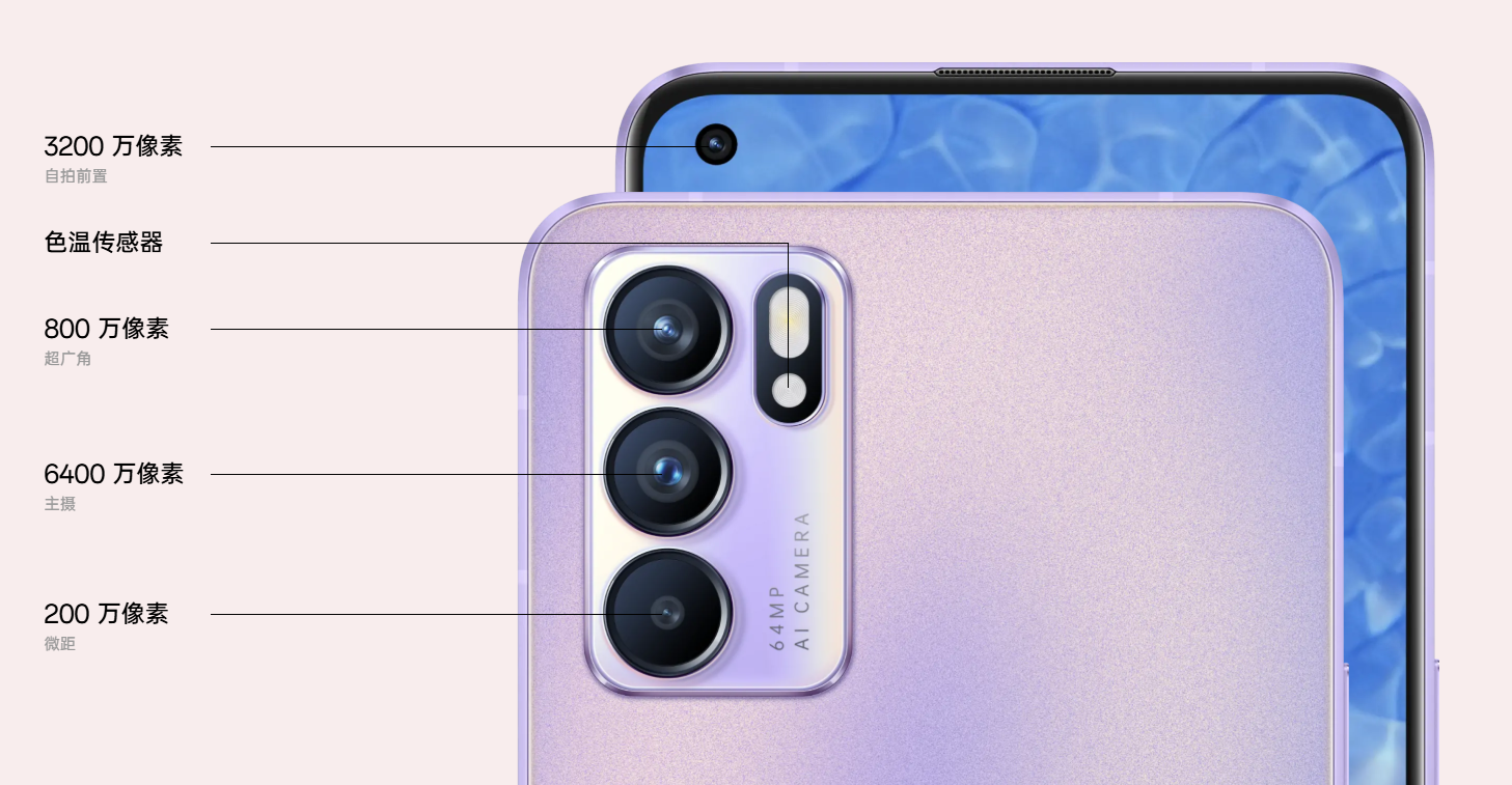 影像方面,光斑人像视频可让点点光斑呈现梦幻效果,无论是白天的树影斑驳还是夜晚的城市灯火,轻松一拍即可惊艳每一个主角时刻。该功能通过超千万级图库训练与背景光源重构技术实现,让科技与裸妆邂逅,带来随时上镜的自由。AI 焕采美妆视频方面,Reno6 牵手全球裸妆大师 Bobbi Brown 设计了 5 款独家定制妆容,先 “底妆” 再 “彩妆”,让用户在光滑无暇的肤感上焕发光彩,还特别为男性和中性风格设计妆容。OPPO 自研美妆算法经过 1000 万 + 人脸训练,通过 635 个人脸检测点让妆容真实贴合,共有 11 款精心设计的妆容,包括裸感、猫眼、清爽、夏日晴海、星黛、烟熏妆等。此外,还有 6 重 100 级美颜调节、自研人脸去瑕疵算法光滑匀肤,以及实时捕捉 42 个虹膜特征点自然提亮眼神光,让自拍中的真实你更加好看。摄像头配置上,前置 3200 万像素,配备色温传感器,后置 800 万像素超广角、6400 万像素主摄与 200 万像素微距镜头,不论远近明暗都能捕捉精妙,与用户分享更多精彩瞬间,如焕采光斑人像视频、AI 焕采美颜视频、焕采补光保护壳、焕采美妆视频、多景录像、视频追焦等。