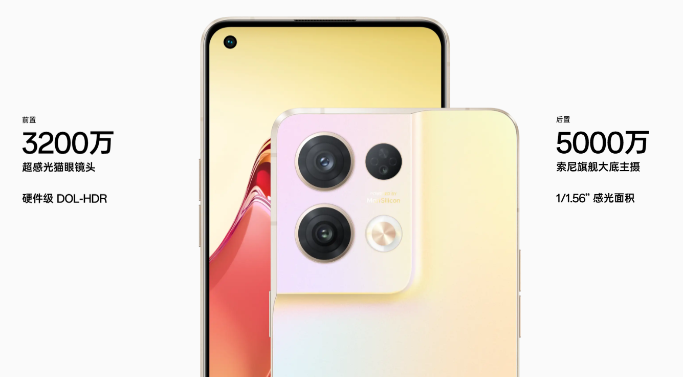 自研影像专用 NPU 芯片,6nm 旗舰制程工艺,18 万亿次 / 秒 AI 算力,20bit 无损画质处理。双芯人像摄影系统,旗舰同款配置:Reno8 Pro 拥有自研马里亚纳 ® MariSilicon X 芯片 ¹,并搭配旗舰人像镜头和 OPPO 独有的人像算法矩阵,形成专业的双芯人像摄影系统,打造细节清晰、色彩真实的拍摄效果。芯片级 4K 超清夜景视频,4 倍于 1080P 视频的高清画质。自研马里亚纳 ® MariSilicon X 芯片拥有 18 万亿次 / 秒的 AI 降噪能力,降低噪点与偏色,极大提升夜景视频纯净度,每一帧都是超清夜景照片。两颗芯片协同计算对比仅使用一颗芯片计算。4K HDR 视频,无惧逆光,通透清晰。自研马里亚纳 ® MariSilicon X 芯片拥有最高 20bit HDR 计算能力,可以呈现更宽广的动态范围,亮部不过曝,暗部也保留了大量的细节,人脸逆光也清晰。两颗芯片协同计算对比仅使用一颗芯片计算。芯片级 APP 相机增强,微信、抖音、快手随手拍都清晰。自研马里亚纳 ® MariSilicon X 芯片能提升微信、抖音、快手等 App 相机拍摄质量,App 内打开相机直接拍摄,也像系统相机一样清晰。原生肌理级自拍,每一寸肌肤都好看。自研马里亚纳 ® MariSilicon X 芯片结合焕采美颜算法,保留大量肤质细节,肤色还原更自然,拍出原生呼吸感。前置 3200 万超感光猫眼镜头,硬件级 DOL - HDR;后置 5000 万索尼旗舰大底主摄,1/1.56” 感光面积。后置逆光人像,明暗都清晰;AI 焕采美妆,一秒上妆,素颜自由;动态抓拍引擎,随手抓拍,出片利器;焕采光斑人像,氛围人像,一拍即得;前置暗光人像,越夜越精彩;AI 焕采美颜,自然清晰有质感。