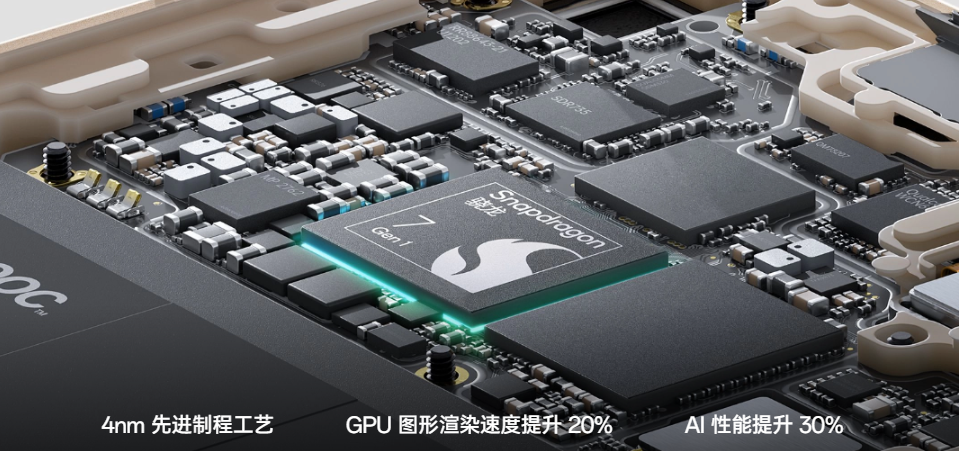 第一代骁龙 ®7 移动平台⁴,全球首发,4nm 先进制程工艺,GPU 图形渲染速度提升 20%,AI 性能提升 30%。3D 恒冷中央散热系统⁵,稳定散热,冷静输出:5690mm² 高性能石墨 | 3174mm² 超薄 VC 液冷结构。长寿版 80W 超级闪充,疾速回血,寿命加倍。80W 超级闪充,10 分钟将 4500mAh 电池充至 45%,31 分钟充至 100%⁶;电池健康引擎,电池充放电循环 1600 次,电池寿命长一倍⁷;智能五芯防护,全方位保护充电安全。120Hz E4 超清屏⁸,高刷流畅,智能护眼:120Hz 高刷新率,1000Hz 瞬时极限触控响应,6.62” OLED 无边界大屏,HDR10 + 认证,第一届英雄联盟手游 WRT 升降级赛指定手机。HyperBoost 全链路游戏稳帧技术,帧率更稳,更省电;X 轴线性马达⁹,4D 振感,身临其境;360° 智能天线,信号更强,上分更稳;超级闪电启动 ¹⁰ 2.0,即刻在线,快人一步。ColorOS 12.1,36 个月流畅双引擎 ^{11},系统减负,时刻流畅:35%↓内存占用减少,12%↑手机续航平均提升,130%↑后台保活能力提升。