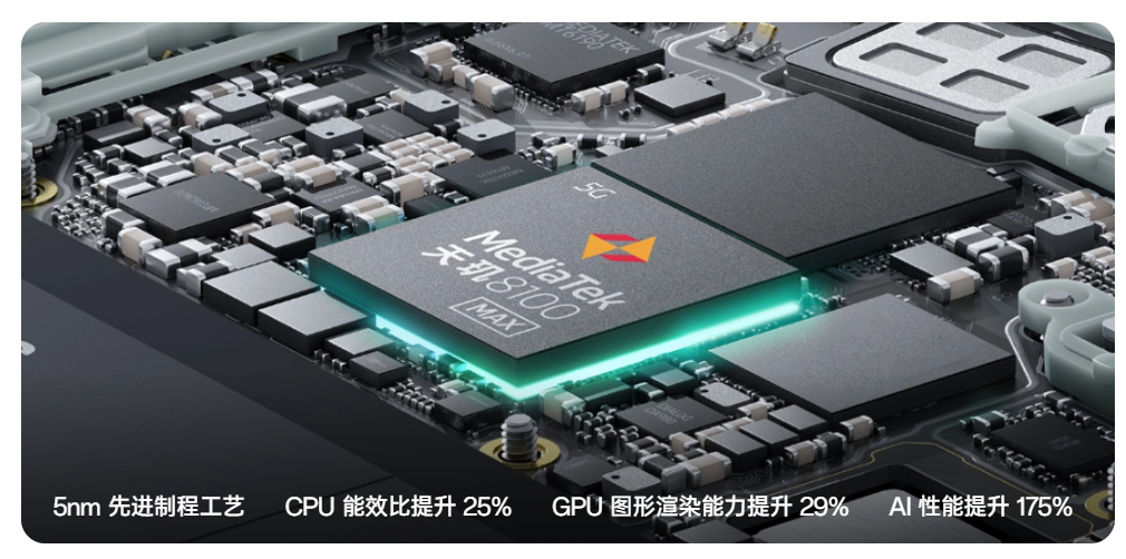 性能方面,天玑 8100-MAX⁴是新一代性能神 U,天玑 8100-MAX + UFS3.1 + LPDDR5 形成满血铁三角组合,具备超强大的计算能力和超级快的数据吞吐性能,真正做到了性能、功耗、温控完美均衡。它采用 5nm 先进制程工艺,CPU 能效比提升 25%,GPU 图形渲染能力提升 29%,AI 性能提升 175%。超晶石墨散热系统⁵能稳定散热,冷静输出,超晶石墨导热率提升 45%,总散热面积高达 32928mm²。长寿版 80W 超级闪充可疾速回血,让寿命加倍,80W 超级闪充 10 分钟能将 4500mAh 电池充至 45%,31 分钟充至 100%⁶;电池健康引擎让电池充放电循环 1600 次后,寿命长一倍⁷;智能五芯防护全方位保护充电安全。120Hz OLED 超清屏⁸采用蓝钻排列,流畅护眼,拥有 120Hz 高刷新率,6.7”OLED 无边界大屏,支持 10 亿色色彩显示,通过 HDR10 + 认证。它还是第一届英雄联盟手游 WRT 升降级赛赛事指定用机,具备 HyperBoost 全链路游戏稳帧技术,英雄联盟手游 5 小时平均帧率 89.99 帧⁹,有 X 轴线性马达 ¹⁰带来 4D 振感,身临其境,360° 智能天线让信号更强,上分更稳,超级闪电启动 ¹¹ 2.0 能让人即刻在线,快人一步,带来畅爽游戏体验。