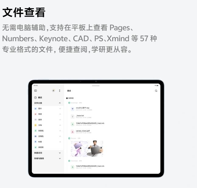 文件查看无需电脑辅助,支持在平板上查看 Pages、Numbers、Keynote、CAD、PS、Xmind 等 57 种专业格式的文件,便捷查阅,学研更从容。格式转换支持 PDF 格式转换为 PPT/Word,同时支持将 Pages、Numbers、Keynote 等格式文件转换为 PDF 格式便捷分享,随时开启移动办公。vivo 远控 PC 可远程连接 Mac/Windows 电脑(支持控制 macOS 及 Windows 10 及以上系统电脑),控制电脑完成文档编辑、应用操作、电脑关机重启等操作²⁶,还支持与 Windows 电脑双向传输文件²⁷,vivo 远控 PC 需要搭配 vivo 办公套件使用,vivo 办公套件需下载 PC 客户端,对应下载及登录网址为:https://pc.vivo.com。PC 协同办公²⁸,vivo 办公套件上登录同一 vivo 账号,连接同一网络,自动连接附近相同账号登录的设备,实现设备近场网络下的无缝连接,连接 vivo 办公套件后,在 PC 端同时搜索、预览、下载手机端&平板端文件到 PC 端(Mac 电脑、手机和平板登录相同账号,接入同一 WLAN 网络,可自动连接;Windows 电脑、手机和平板登录相同账号,并打开蓝牙或 WLAN 开关,接入同一网络可自动连接)。