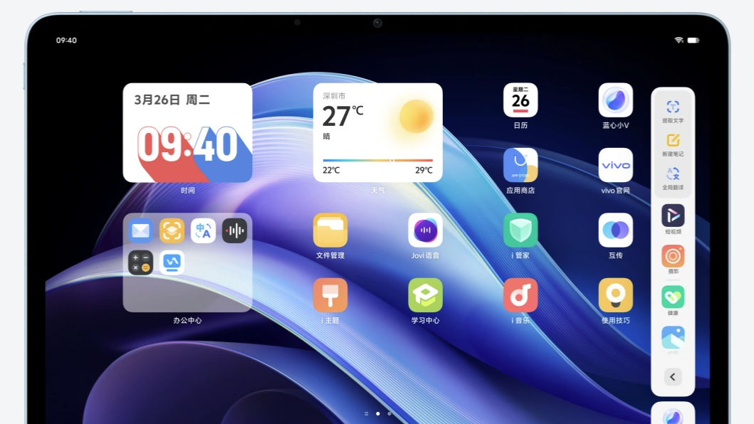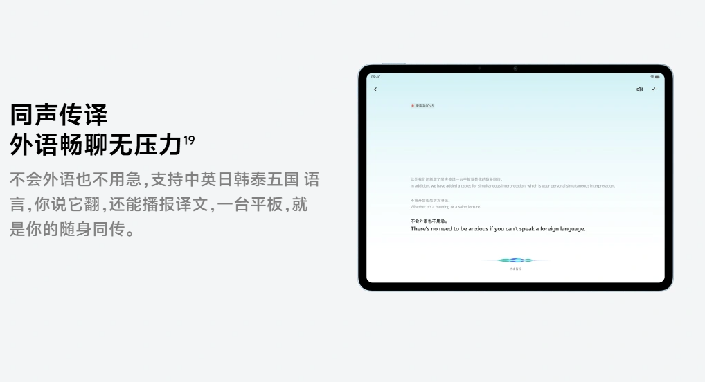 手写笔记十倍画布¹⁹,画布至高支持 10 倍缩放,容纳无限灵感,不管是做思维导图、手账还是绘画,一缩画面更完整,一放细节更丰富;手写笔记支持随时书写灵感,拥有丰富创作工具、底纹版式,支持图文混排、多页概览等,笔记记录自由随心;笔记编辑强大又高效,支持卡片形式添加视频、音频,还支持创建多级文件夹管理笔记。4 个任务高效处理,2 小窗 + 2 分屏,多线程任务解放生产力;小窗卡片列表以侧边缩小预览图呈现,任务切换一目了然;单应用多窗支持单应用打开多个页面,WPS、微信、vivo 文档等可多窗同时查看。同声传译功能让外语畅聊无压力¹⁹,不会外语也不用急,支持中英日韩泰五国语言,你说它翻,还能播报译文,一台平板,就是你的随身同传。