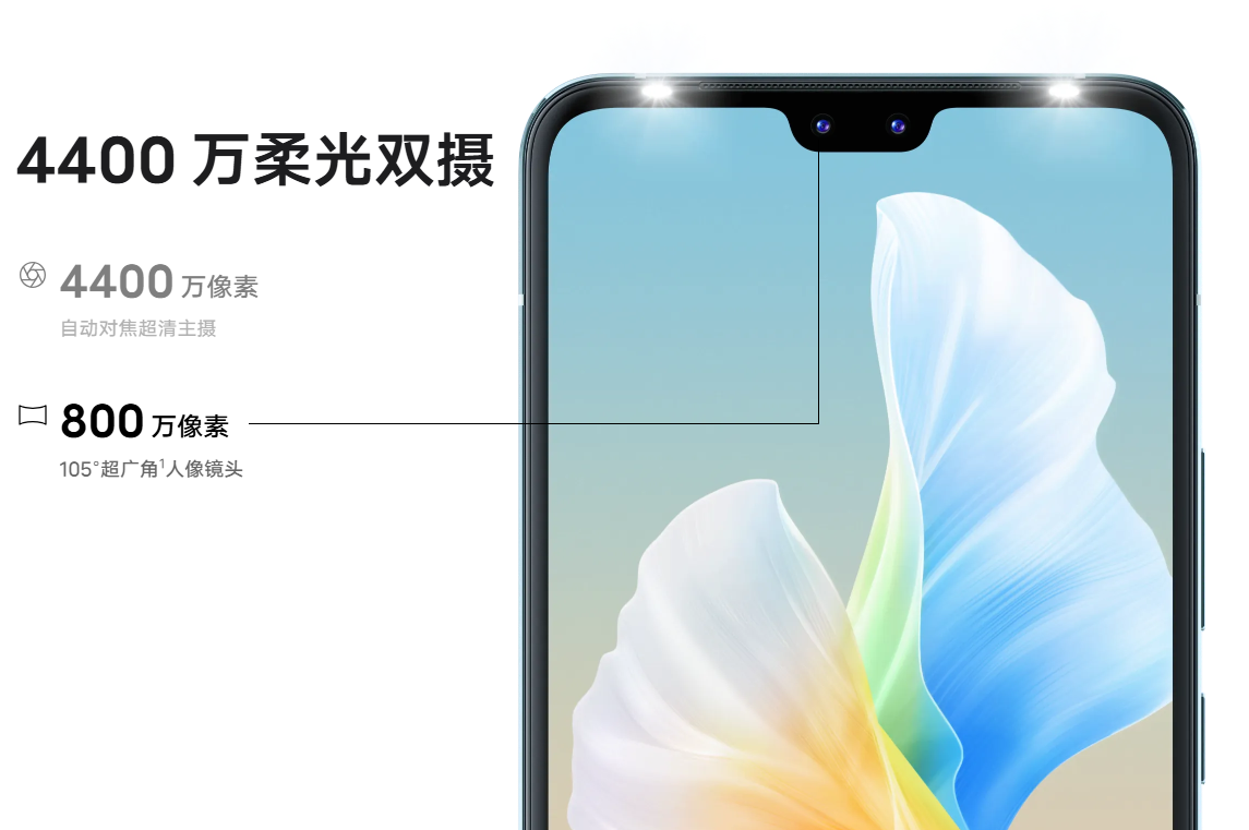 自然柔光人像拍摄系统,4400 万像素自动对焦超清主摄与 800 万像素 105° 超广角人像镜头组成的前置双柔光灯系统1,可全局补光让你在暗环境下也能清晰展现自我。全新升级的自然人像算法能保留独特魅力,让照片中的你美得刚刚好,更具质感与高级感。夜晚拍摄时,前置双柔光灯搭配超清夜景人像算法,通过 AI 提亮和 AI 降噪智能修复暗环境下不清晰的人像五官细节,同时优化提亮背景环境,实现柔光夜景人像随心拍皆清晰的效果。此外,超广角夜景合拍功能让大合影轻松完成,晚间拍 vlog 时柔光灯更能让你一出镜就足够亮眼,尽情分享夜生活。