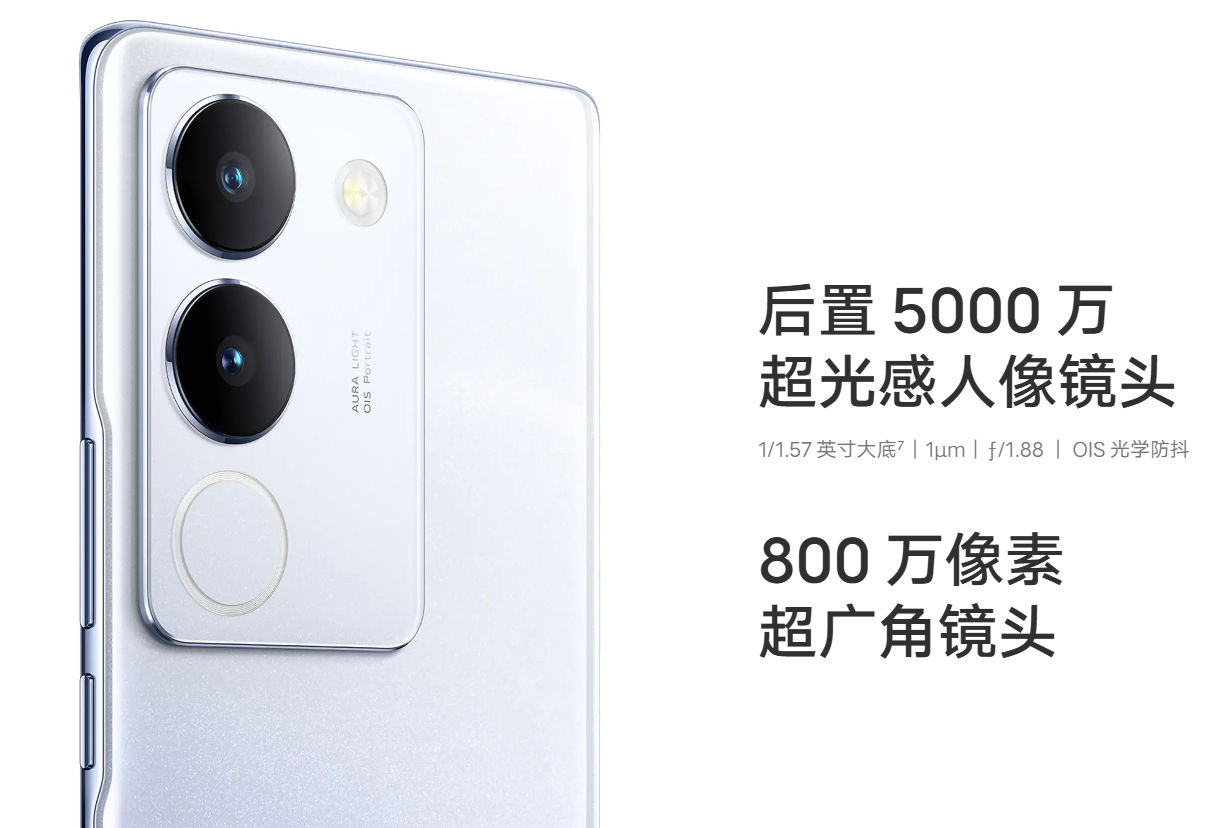 前置 5000 万广角柔光:vivo 最大前置 f/2.0 光圈,进光量提升 50%⁶,清晰亮眼;vivo 最高前置 5000 万像素,大有细节;AF 自动对焦,远近都清晰;90° 广角柔光,合拍也明亮 ——f/2.0 超大光圈,搭配 90° 广角双柔光,暗光下脸部亮度高光十足,毛发纹理清晰细腻。后置 5000 万超光感人像镜头:1/1.57 英寸大底⁷|1μm|ƒ/1.88|OIS 光学防抖,800 万像素超广角镜头。