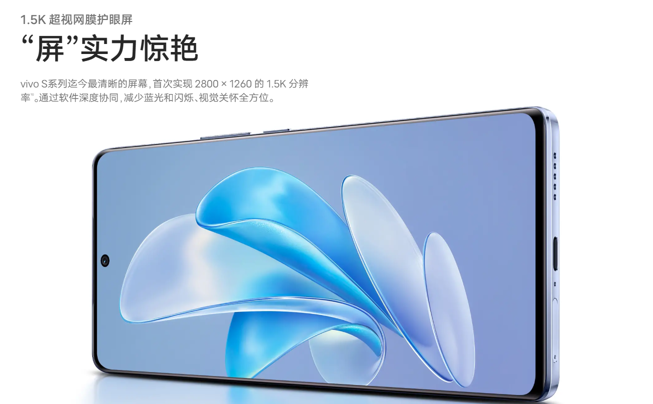 1.5K 超视网膜护眼屏:“屏” 实力惊艳 ——vivo S 系列清晰的屏幕,首次实现 2800×1260 的 1.5K 分辨率10。通过软件深度协同,减少蓝光和闪烁,视觉关怀全方位。屏幕参数:电影级广色域标准(100% P3 色域),局部峰值亮度 1300nits,超高对比度 8,000,000 : 1(64 倍于普通屏幕10),10 亿臻彩显示,超视网膜像素密度 452 PPI,字体清晰锐利,类钻像素排列,观感细腻丝滑;120Hz 刷新率10,动态调节色温助眠(舒眠模式),有害蓝光降低至 6.5%10(硬件级低蓝光),定制化色彩显示(色觉增强10),夜间不伤眼,至高 2160Hz 高频调光。