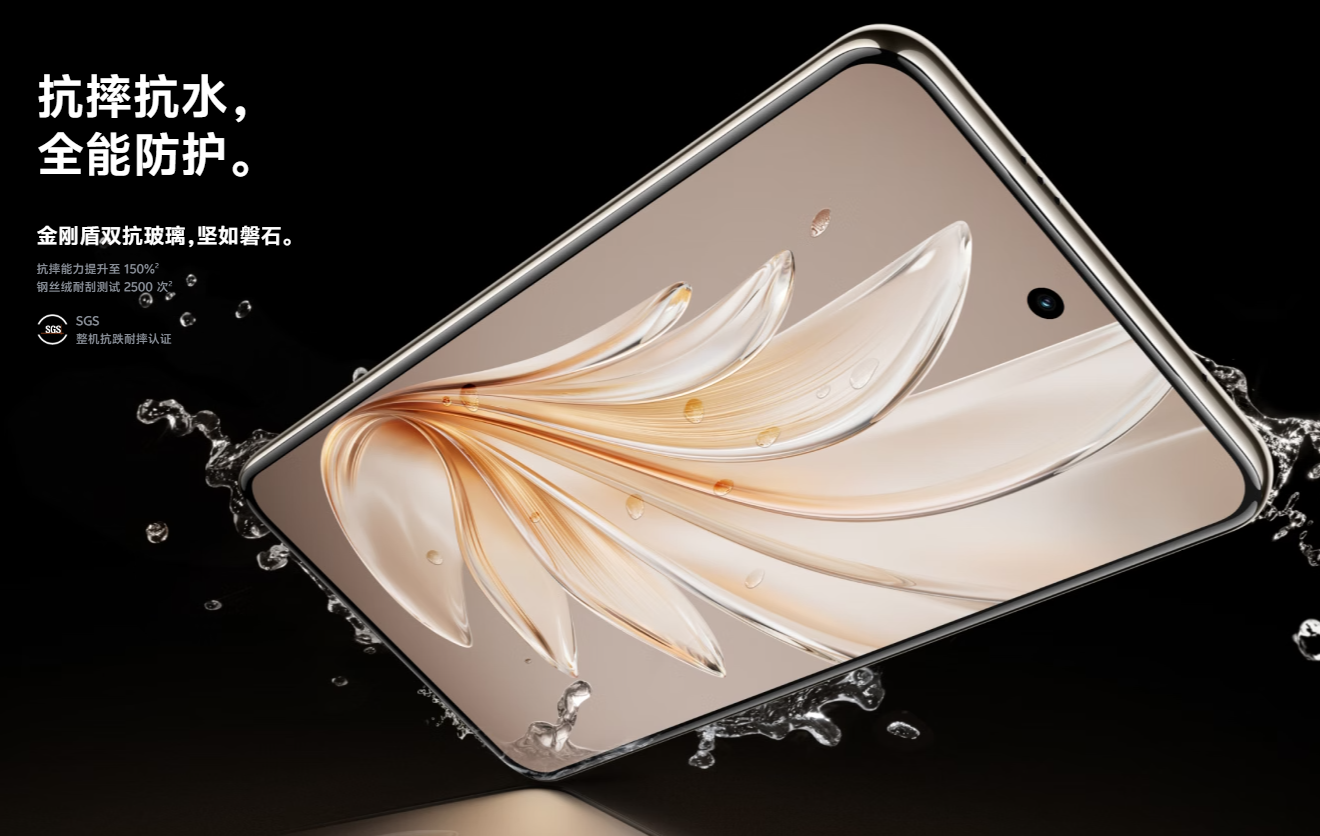 抗摔抗水,全能防护。金刚盾双抗玻璃,坚如磐石。抗摔能力提升至 150%2,钢丝绒耐刮测试 2500 次2。SGS整机抗跌耐摔认证。抗水防油,随心触控。满级防尘、12 小时抗雨淋,风吹雨淋中也支持湿手和油手触控3,洗漱或吃饭湿手,也能回消息、刷视频。中国质量认证中心防水认证。