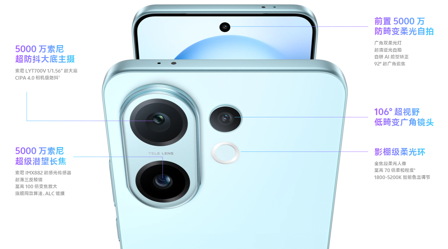 影像方面,行业首创「实况模式」²,让 Life,更 Live,行业首次单独成立「实况模式」²,与人像、视频模式有着同样完整、全面的功能和体验。实况照片支持叠加多种不同情绪风格的胶片色彩,让你记录的鲜活瞬间超有氛围感,除了经典负片风格、经典正片风格、清透蓝调风格,还有胶片蓝、胶片绿、夏日花火,共计 6 款色彩风格随心选。还有五大电影氛围特效齐登场,让你的实况照片绘声绘“影”,宛如电影大师“附体”,氛围感再升级,包括鱼眼萌主、DV 录制框、老电视框、氛围花瓣、柔光,超美超好玩。实况照片也有美颜算法加持,自然妆照好气色,生动更心动,支持微信³、小红书等多个主流平台编辑或分享,让你的美被更多人看见!支持实况拼图功能,以及多种拼图风格和边框样式,拼好更有故事感。可随心截取视频片段并转存成实况照片,哪里好看就选哪,让你的高光时刻更易分享,视频转实况照片后,实况照片与原视频的分辨率一致,最高不超过 1080P⁴。5000 万索尼超级潜望长焦,把远景拉进画框里,配备旗舰同款索尼 IMX882 超感光传感器,1/1.95″ 超大尺寸,旗舰同款大底传感器,采用超薄三反棱镜,三重棱镜反射光路设计,减少镜头凸起面积。10x 长焦风光,旅行打卡更出片,长焦构图神器,旅途拍照,小白也能秒变大神,通过自研原像引擎和大模型画质增强技术,在 10x 及以上变焦时,画面更清晰,细节表现提升明显。5000 万索尼超防抖大底主摄,搭载索尼 LYT700V 1/1.56″ 超大底,支持 CIPA 4.0 相机级防抖⁵,5000 万索尼超级潜望长焦搭配索尼 IMX882 超感光传感器、超薄三反棱镜,至高 100 倍变焦放大,还有旗舰同款算法、ALC 镀膜加持。前置 5000 万防畸变柔光自拍,配备广角双柔光灯,支持超清逆光自拍、自研 AI 脸型矫正,92° 超广角追焦,106° 超视野低畸变广角镜头,影棚级柔光环,全焦段柔光人像,至高 70 倍柔和程度⁶,1800-5200K 智能色温调节,全焦段影棚级人像,远近明暗,怎么拍都美。5 大黄金焦段覆盖,封面大片轻松直出,分别为 50 mm 经典人像、85 mm 肖像写真、100 mm 特写人像、23 mm 风光人像、35 mm 叙事人像。自研 AI 3D 虚拟补光技术,消除画面雾感的同时,对人脸进行多角度虚拟补光,使得逆光自拍脸不黑,背景纯净人立体,皮肤清透有质感;自研 AI 脸型矫正算法,前置自拍面部畸变烦恼轻松解决,成像接近 50mm 焦距的人眼效果,广角自拍脸部不变形,还原镜中美貌。一拍得胶片相机⁷ 全新升级,不但支持实况照片拍摄,还新增三大胶片色彩和自定义复古特效,专属相机界面营造复古相机质感,复古的图标和成像动效,都与流行的一拍即得玩法一致,联动打印机⁸,还能打印实况封面帧,仪式感拉满,适配的打印机型号为汉印 CP2100。AI 魔法影像有妙用,超实用,包括 AI 魔法移动、AI 四季人像⁹、AI 反光消除功能:轻轻一拖,所愿皆获,长按你想移动的主体,选择「魔法移动」,拖拽主体到理想的位置,AI 将对变更后的画面,自动补全背景、光影,让画面自然、真实;春夏秋冬,一键穿越,让你的照片更有故事感,也更浪漫;反光退退退,让你的美清晰可见,适用场景更多,博物馆、身份证、常见玻璃反光等均可轻松解决。