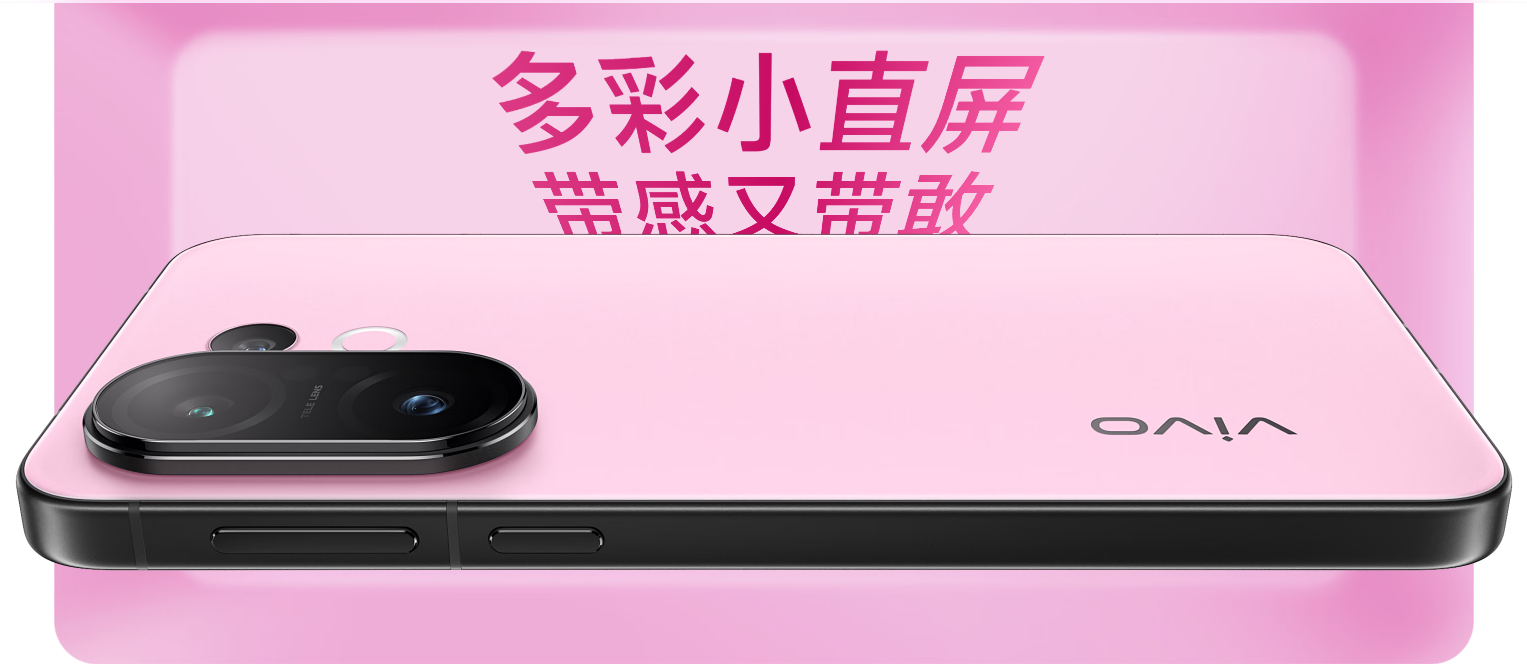 多彩小直屏,带感又带敢;果味多彩,质感潮色,撞色中框,天生带敢,6.31英寸小直屏,轻巧称手¹。氛围胶片实况、旗舰潜望长焦,行业首发希区柯克变焦实况,全新氛围感胶片实况,5000万索尼超级潜望长焦。机身如此mini,性能如此强大:6500mAh超薄蓝海电池¹²,行业首发SGS三防认证,蓝晶×天玑9300+,OriginOS 5迅捷有AI,“果”然好用,全屏全天候熄屏显示²⁷,一碰传²⁹,AirPods弹窗、查找³⁰。果味超多彩,触感超冰爽,年轻,就要敢闯敢撞;6.31英寸小直屏,一手掌握,坚韧航空级铝金属中框+极窄黑边,正看侧看都有型,玲珑镜组,身形小颜值高,配色包括酷莓粉²、薄荷青、柠檬黄²、可可黑。