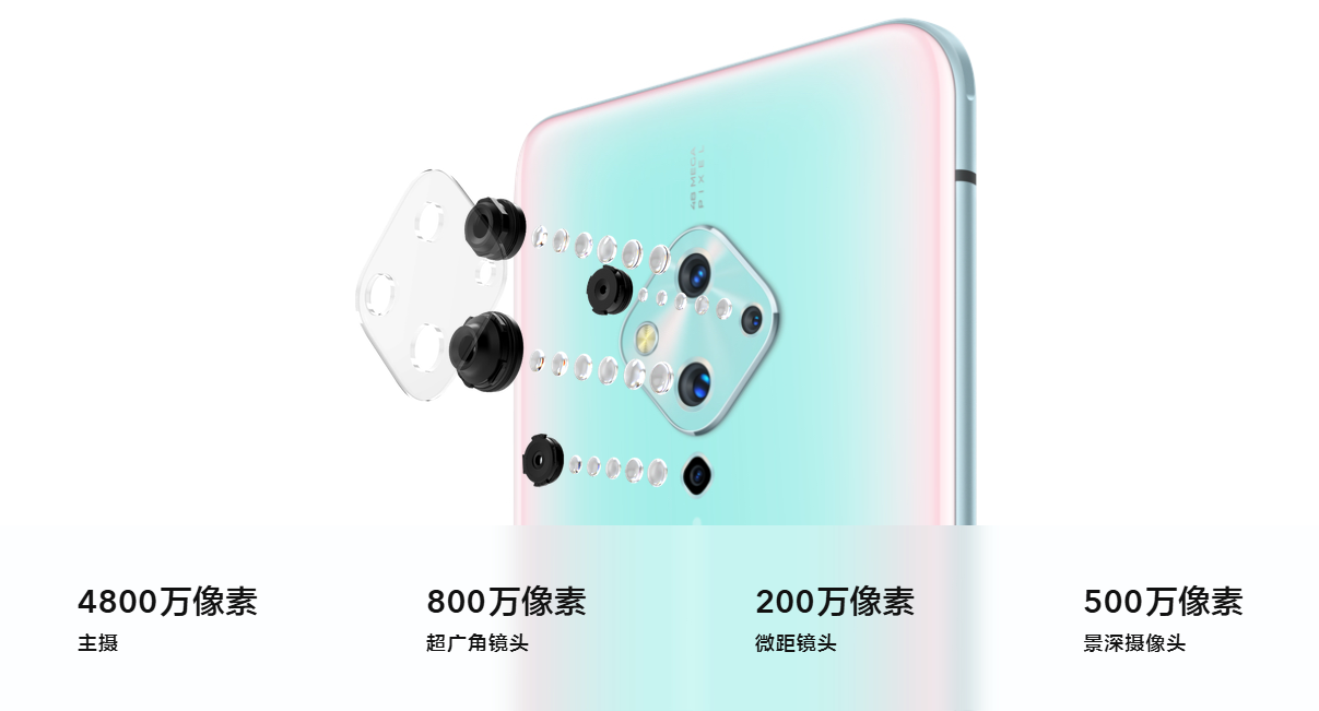 | 后置相机: | 4800万像素主摄像头(像素聚合技术)+ 800万像素广角摄像头+200万像素微距摄像头+ 500万像素景深摄像头(实际输出像素有裁剪) 光圈:f/1.79(后置主摄),f/2.2(后置广角), f/2.4(后置微距),f/2.48(后置景深) |